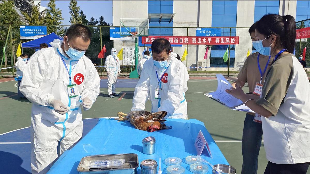 在现场技能考核环节,参赛选手们沉着应战,技术娴熟,他们相互配合,在规定的时间内依次完成鸡翅静脉采血、鸡心脏采血和鸡体解剖与采样三项操作规程。