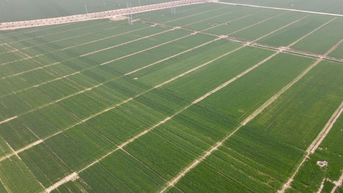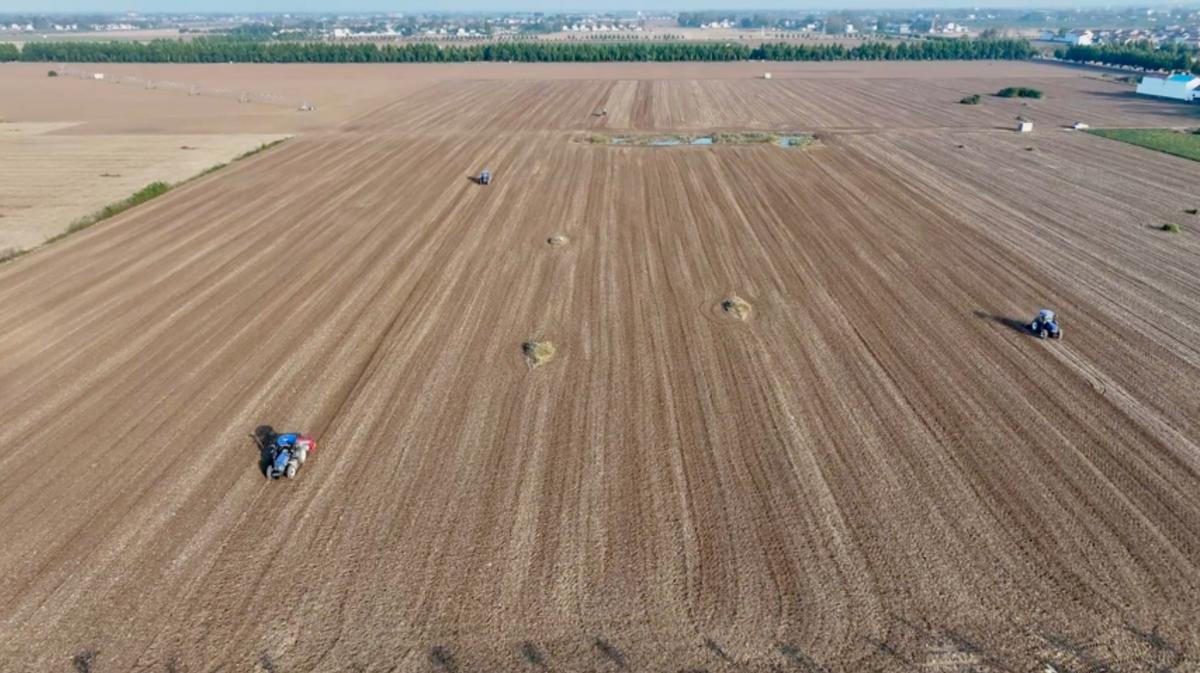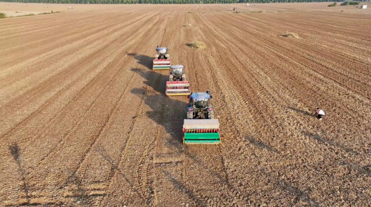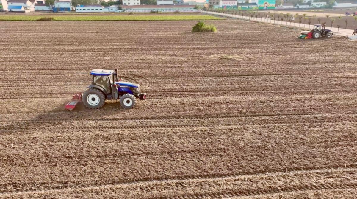 在郸城县高标准农田示范区内,翻土机、施肥机、小麦播种机轮番上阵,一粒粒饱满的麦种被播进土壤里。
